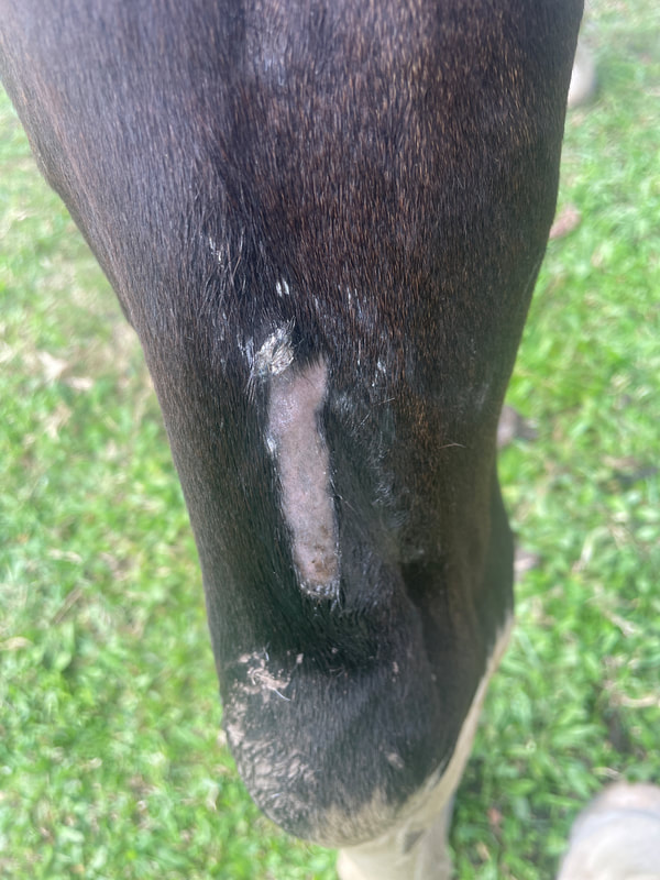 "My boy is always playing with the other horses and he always comes off the worst. He received a leg scrape the other day so I applied the Equine Skin Relief balm to it in the evening, but not everyday and you can see on Day 13 its virtually gone. Next time I will apply more often and perhaps get quicker results!" |