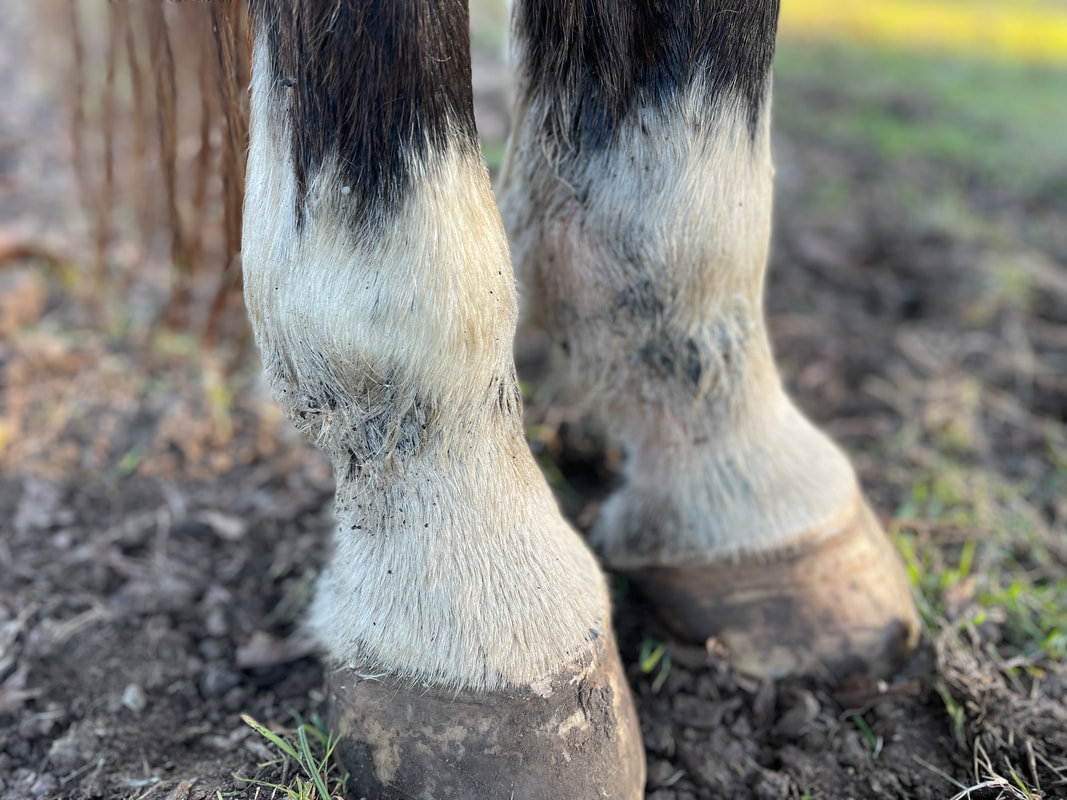 "After all the rain we’d had, my horses came down with mud fever. I started applying Equine Skin Relief to the scabs, and within just three days, I could comb through their feathers again — completely free from mud fever and all the nastiness that comes with it! I’m so impressed with how quickly it worked.” Day One pictures are at the top, day two bottom left and day three is bottom right |